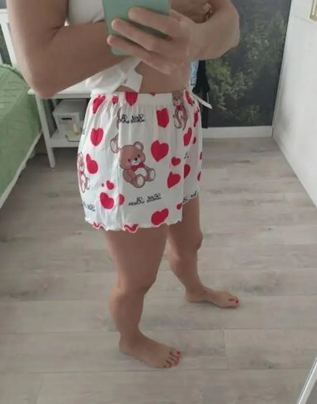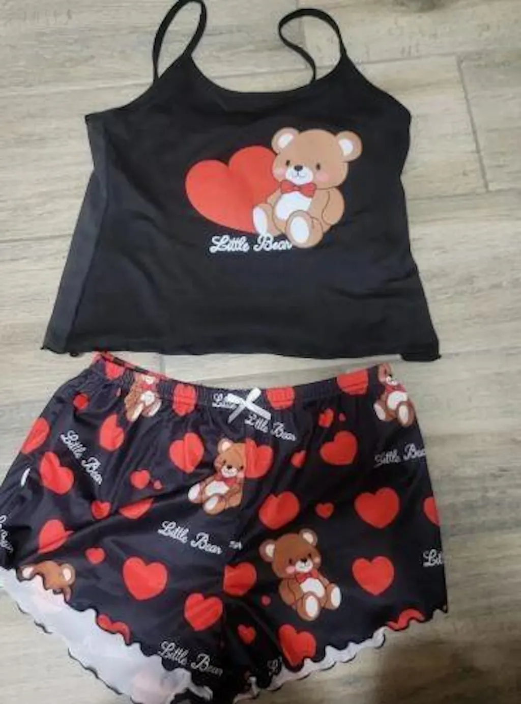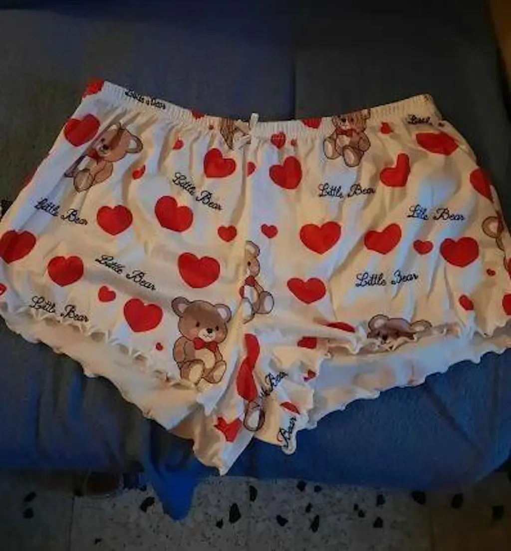 Un set de pijama fermecător cu ursuleți de pluș și inimi, cu un top scurt cu volane și decolteu rotund combinat cu pantaloni scurți confortabili elasticizați. Ideal pentru serile confortabile de acasă.