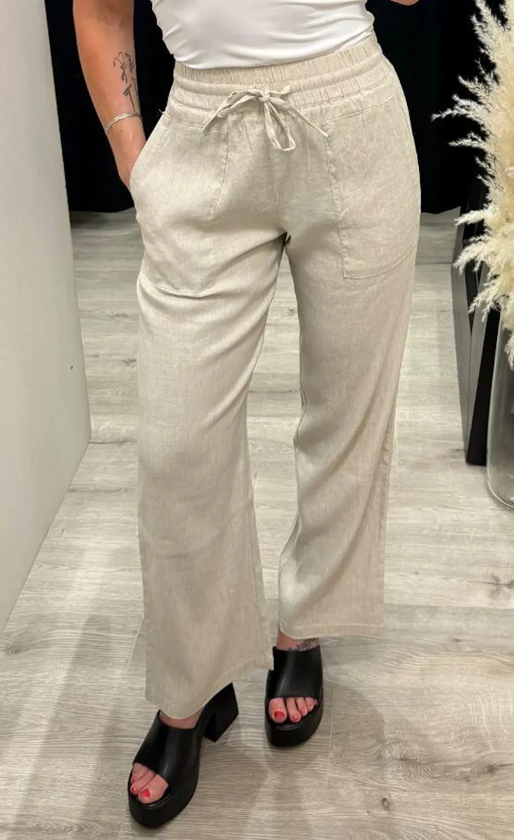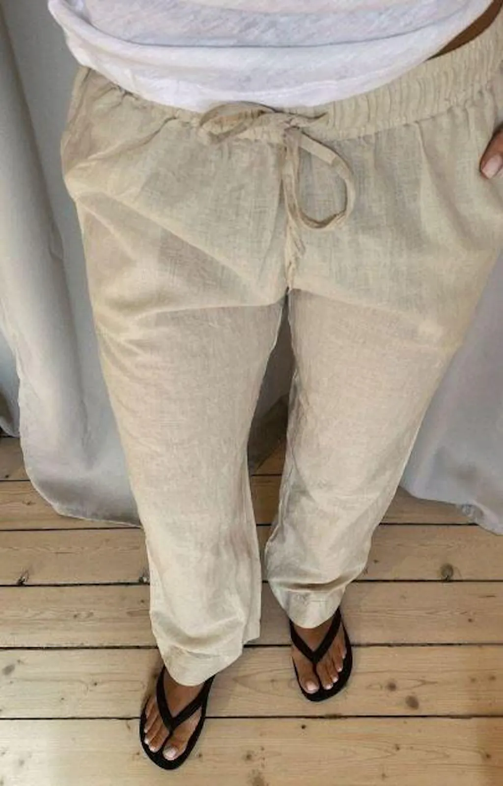 Pantaloni de dama usori si confortabili din bumbac si in – perfecti pentru vara, cu talie elastica si buzunare. O alegere perfectă pentru o vacanță, plajă sau plimbare.