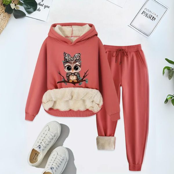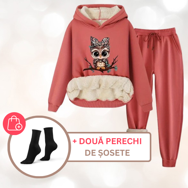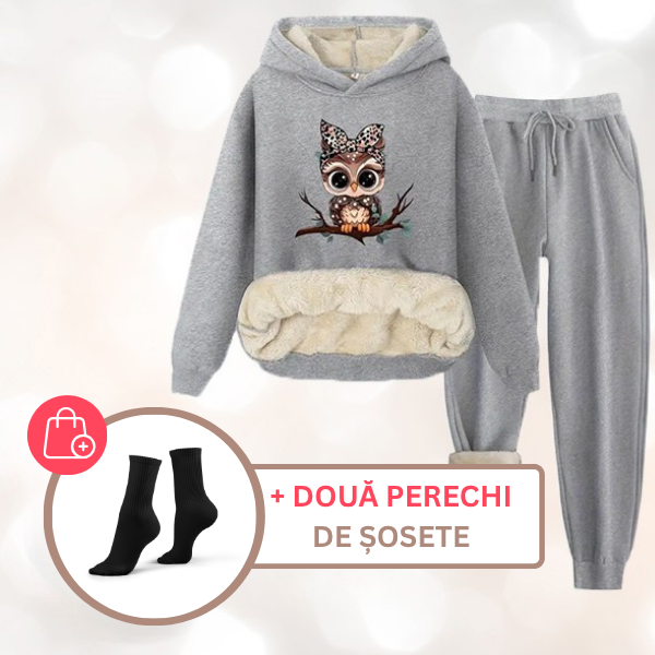 Set cu imprimeu bufniță: hanorac cald cu mânecă lungă și pantaloni pentru toamnă și iarnă.