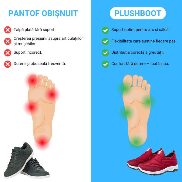 De ce să alegeți PlushBoot? PlushBoot este mai mult decât un simplu pantof - este o soluție pentru o viață mai sănătoasă și mai confortabilă. Ajută la prevenirea durerilor de picioare și la îmbunătățirea posturii. Mai mult, este ideal pentru utilizarea zilnică, deoarece combină funcționalitatea cu un aspect elegant.